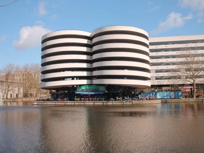 Europarking was designed by Piet Zanstra and is also known by the name of ‘Zanstra’s buttocks’, due to its peachy curves facing the canal.